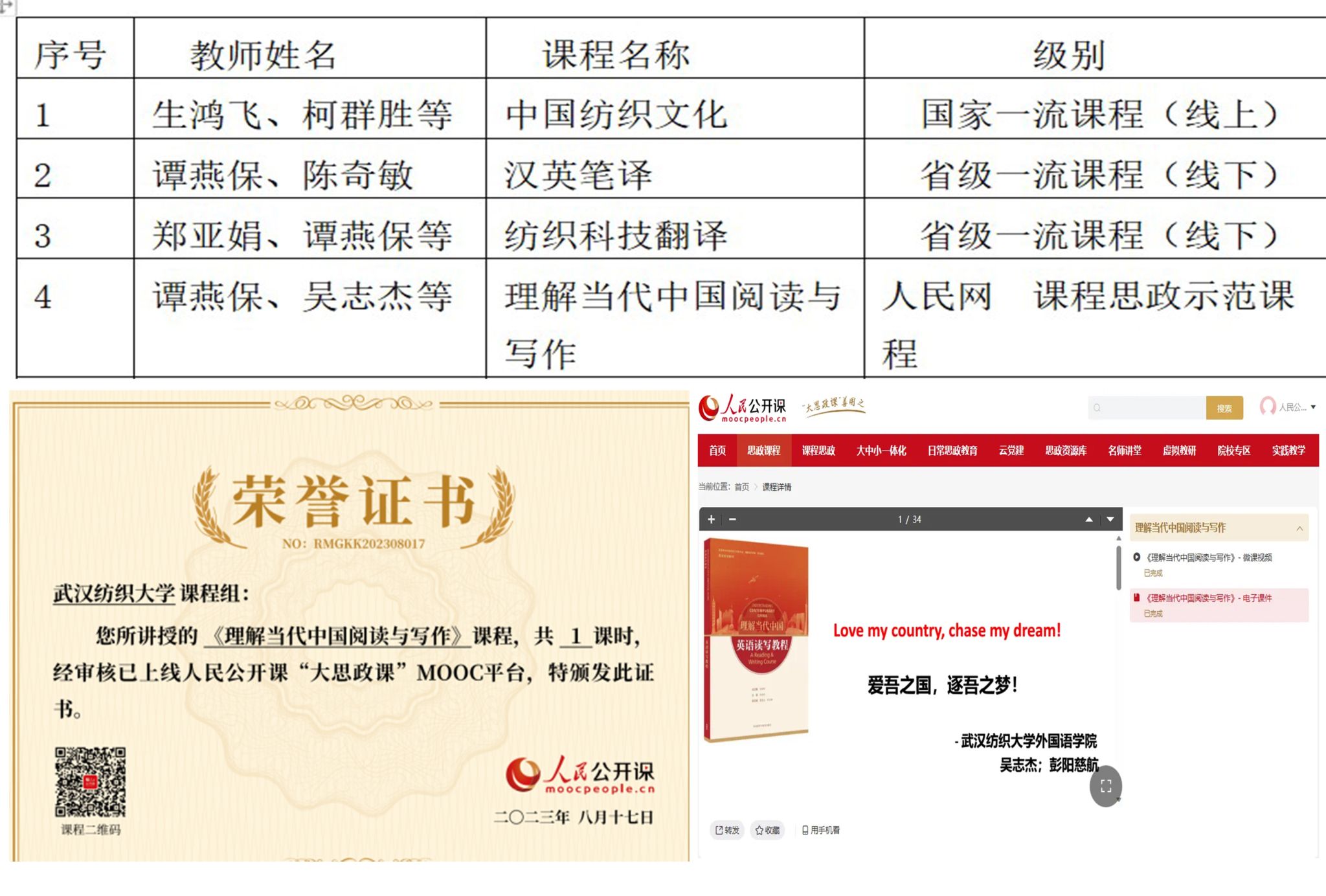 三、连续2年获批湖北省省级线下一流课程1门,《理解当代中国阅读与写作》课程荣列人民网“人民公开课大思政示范课”,学院课程建设取得新进步。9月,《理解当代中国阅读与写作》课程成功上线人民网-人民公开课,荣列人民网“人民公开课大思政示范课”;11月,省教育厅印发《关于公布2023年度省级一流本科课程认定结果的通知》,郑亚娟主持《纺织科技翻译》课程获批2023年度省级线下一流课程。