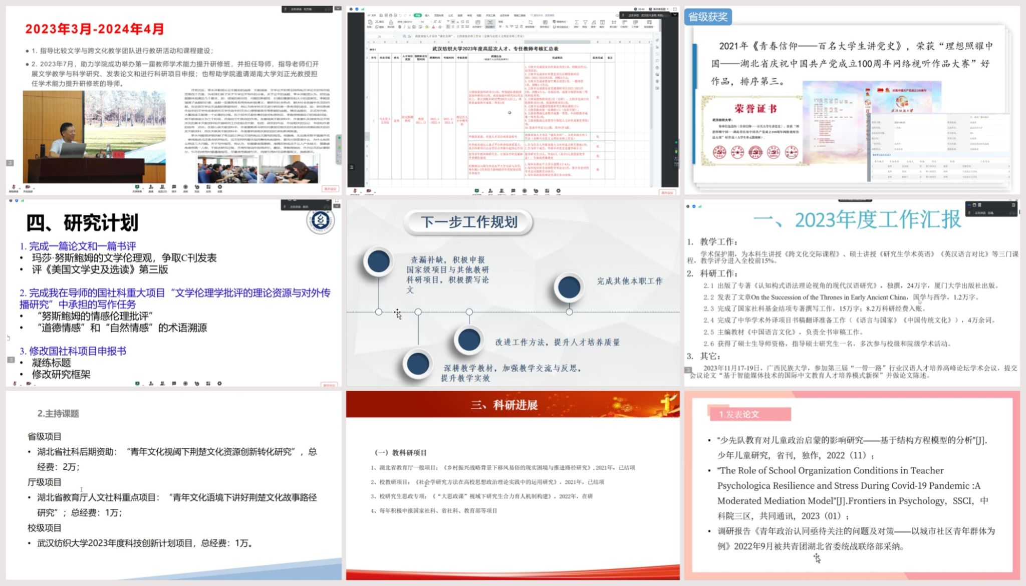 阳光讲席教授季水河分别委托团队成员常沛和刘方荣做报告发言,介绍了近3年指导学校马克思主义理论学科、外语学科在人才培养、学科建设方面所做的工作和取得的成果。马克思主义学院阳光特聘教授金艳、王海燕展示了在教学质量提升、科研成果产出和社会服务等方面的突出成绩。张守慧、李少多、陈春兰等12名参加2023年度考核的博士专任教师对照合同任务,逐一报告了任务完成情况。