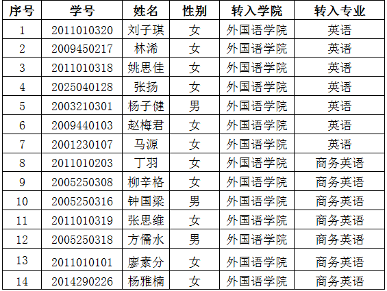经过成人文学 的笔试、口试及面试,现决定根据成绩排名接受以下同学的转专业申请,特此公示。