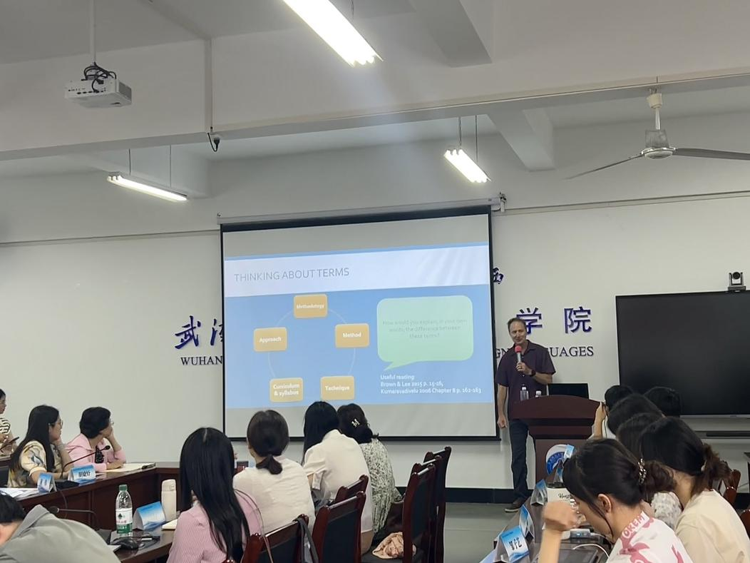 Brent Wolter展开首场专题授课,系统梳理了当代主流英语教学法体系,重点解析了交际教学法的理论框架与实践应用。他通过丰富的课堂案例和互动性强的教学活动,引导学员分组沉浸式体验交际教学法的精髓,并指导学员设计基于真实交际情境的任务型教学活动。