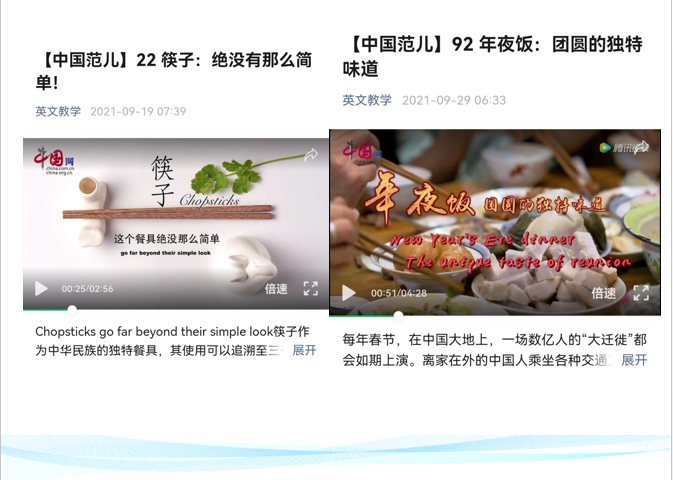 在整个教学设计中,李老师非常巧妙地、润物细无声地融入了大量课程思政元素,把中西方饮食传统和文化进行了对比,如西方汉堡和中国宫保鸡丁的制作方法,西餐和中餐的餐桌礼仪。最后在布置课后作业环节又选取了往年的四级翻译真题“介绍中国的团圆饭”,与该单元主题紧密相关。