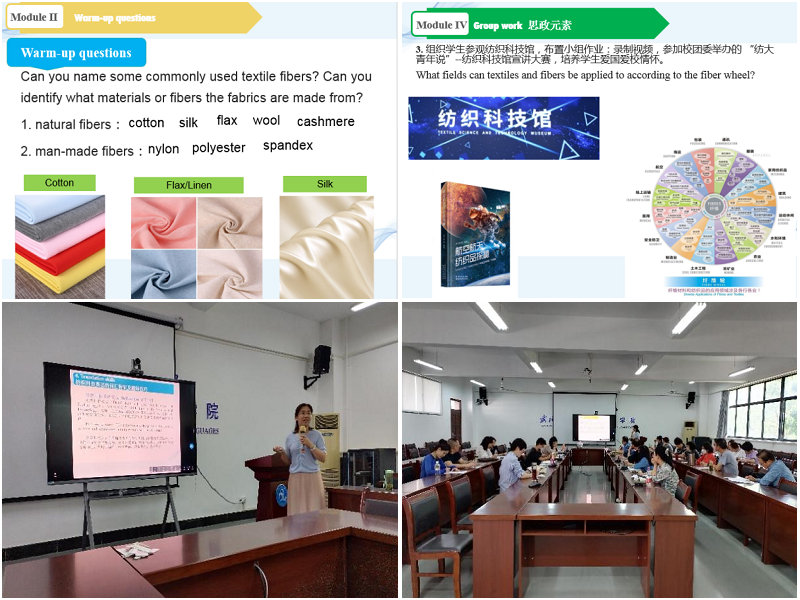 大英二教学部和MTI全体教师在4号楼303会议室开展了郑亚娟老师的课程观摩活动——“纺织科技英语词汇特点和翻译技巧—以纺织纤维为例”。该课程是成人文学