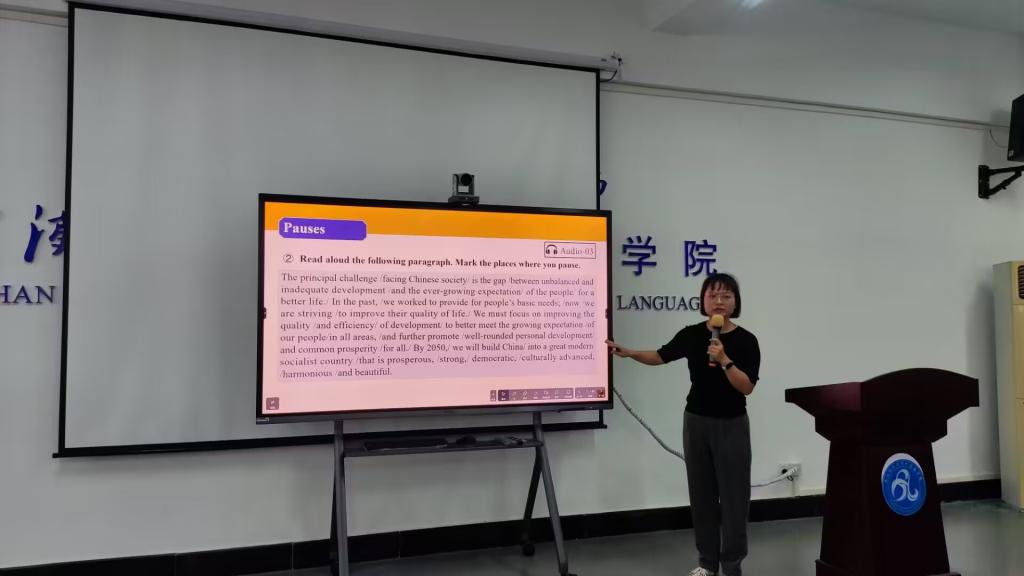 首先,曹婷老师向大家展示了《英语演讲与当代中国》的教学。本次教学,曹婷老师的教学目标是让学生掌握英语演讲中停顿的功能;让学生学会在演讲中运用相关依据来证明自己的论点,从而增强说服力;让学生理解我国的扶贫政策、措施和所取得的成就;让学生学会用英语向世界讲述我国的扶贫故事。
