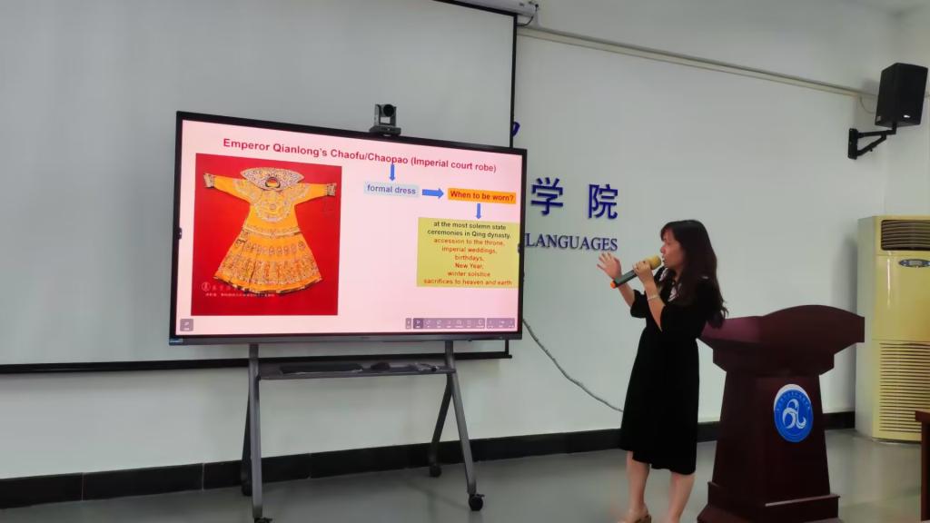 接着,余演老师向大家展示了《服饰文化翻译》课程的教学。余老师分享的教学设计是《服饰文化翻译》课程第六讲的内容——传统服装翻译实践及技巧训练专题:龙袍+分译与合译。余老师的教学目标包括:学生了解和熟悉龙袍的历史和文化内涵;熟悉龙袍相关的基本语汇及其汉英表达方式;掌握分译与合译的翻译技巧,并通过翻译实践训练提高对龙袍主题相关服饰文本的汉英翻译能力。余老师的教学过程如下:首先,立足中西对比,通过不同课堂任务的设计,引导学生深刻理解龙袍的历史文化渊源;其次,通过大量与龙袍相关的语料文本改编的任务形式让学生较快积累与龙袍相关汉英表达的语汇;最后,通过不同形式的翻译任务,让学生在翻译实践中实现词汇表达与翻译技巧的应用,提高服饰文化翻译能力。