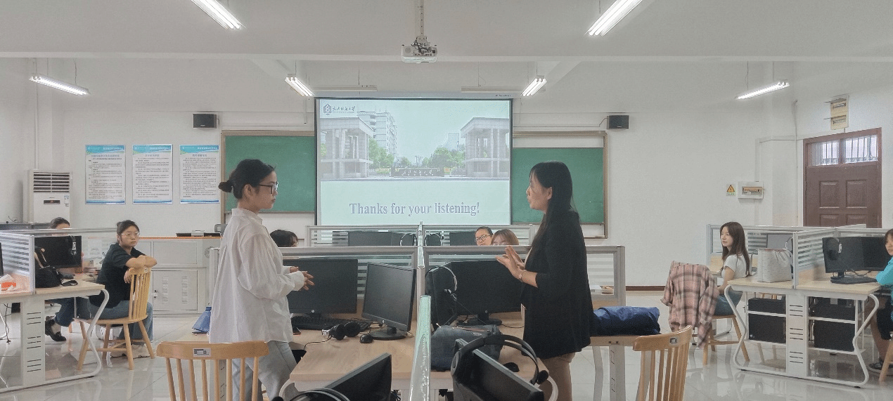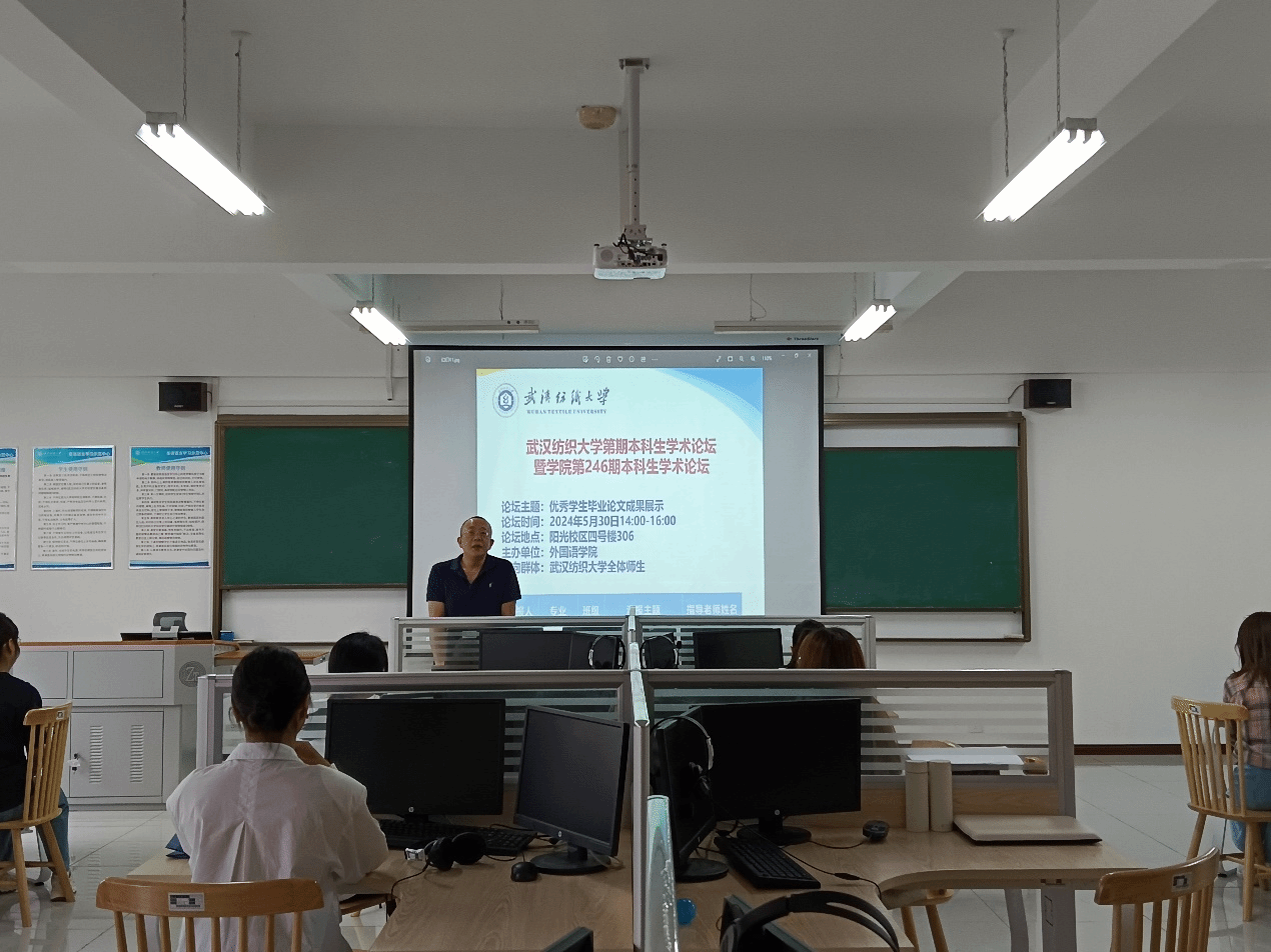 首先,英语12001班的曾钰璇同学从研究背景及意义、研究方法、研究结论以及研究的局限性这四个部分介绍了她的论文《基于大数据的纺织非遗文本人工智能翻译质量评估研究》。李顺亮老师点评时,表明该论文将学校特色与目前最受欢迎的人工智能相结合,是很好的选题。