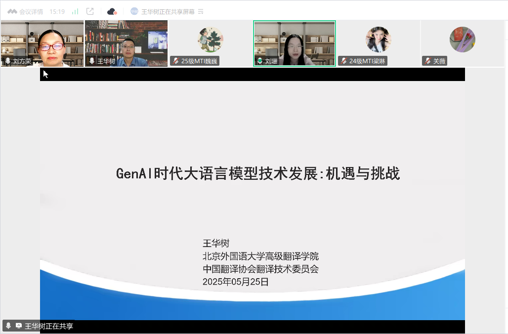 第69期崇文讲堂在线上成功举办。本次论坛特邀北京外国语大学人工智能与语言教育研究中心王华树教授作题为"GenAI时代大语言模型技术发展:机遇与挑战"的学术讲座,讲座由MTI教育中心主任、“人工智能赋能翻译技术”教学团队负责人刘珊主持。