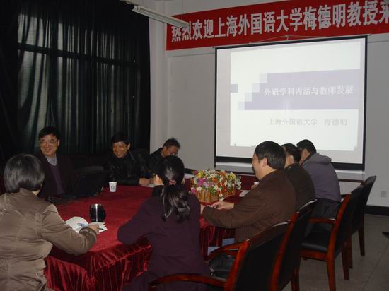 院长何畏主持,英语系和大学英语教学中心的教师们聆听了此次讲座。
