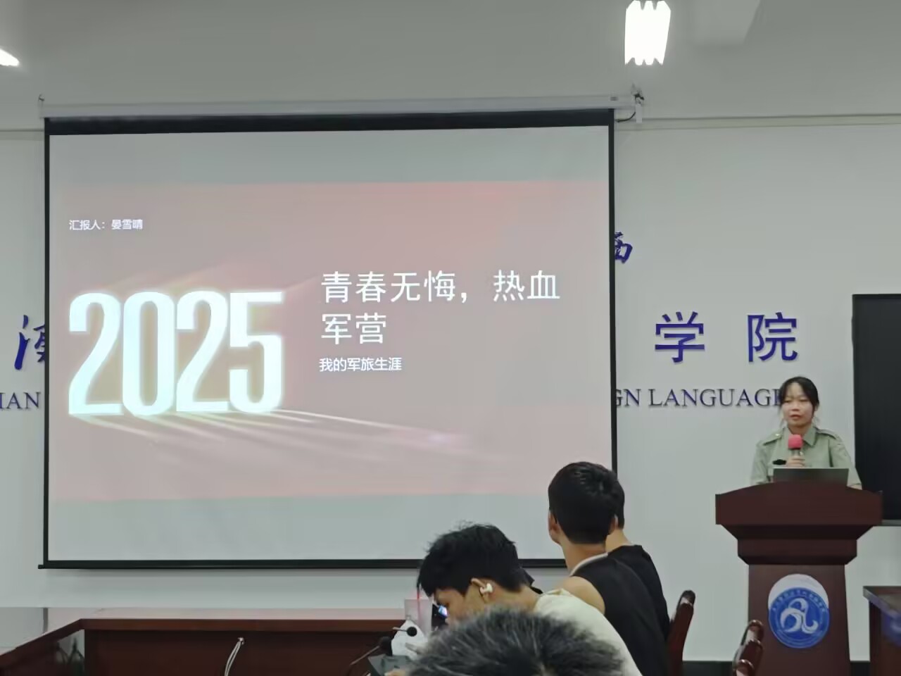 值得一提的是,此次班会还进行了退伍学生士兵朋辈交流活动。商务英语12401班的晏雪晴通过图片向学生介绍部队的生活和训练情况,回答学生关于入伍的疑惑。她号召同学们积极入伍,不要在青春的日子里选择安逸,要在绿色的方阵中绽放青春光彩,书写属于自己的壮丽篇章。