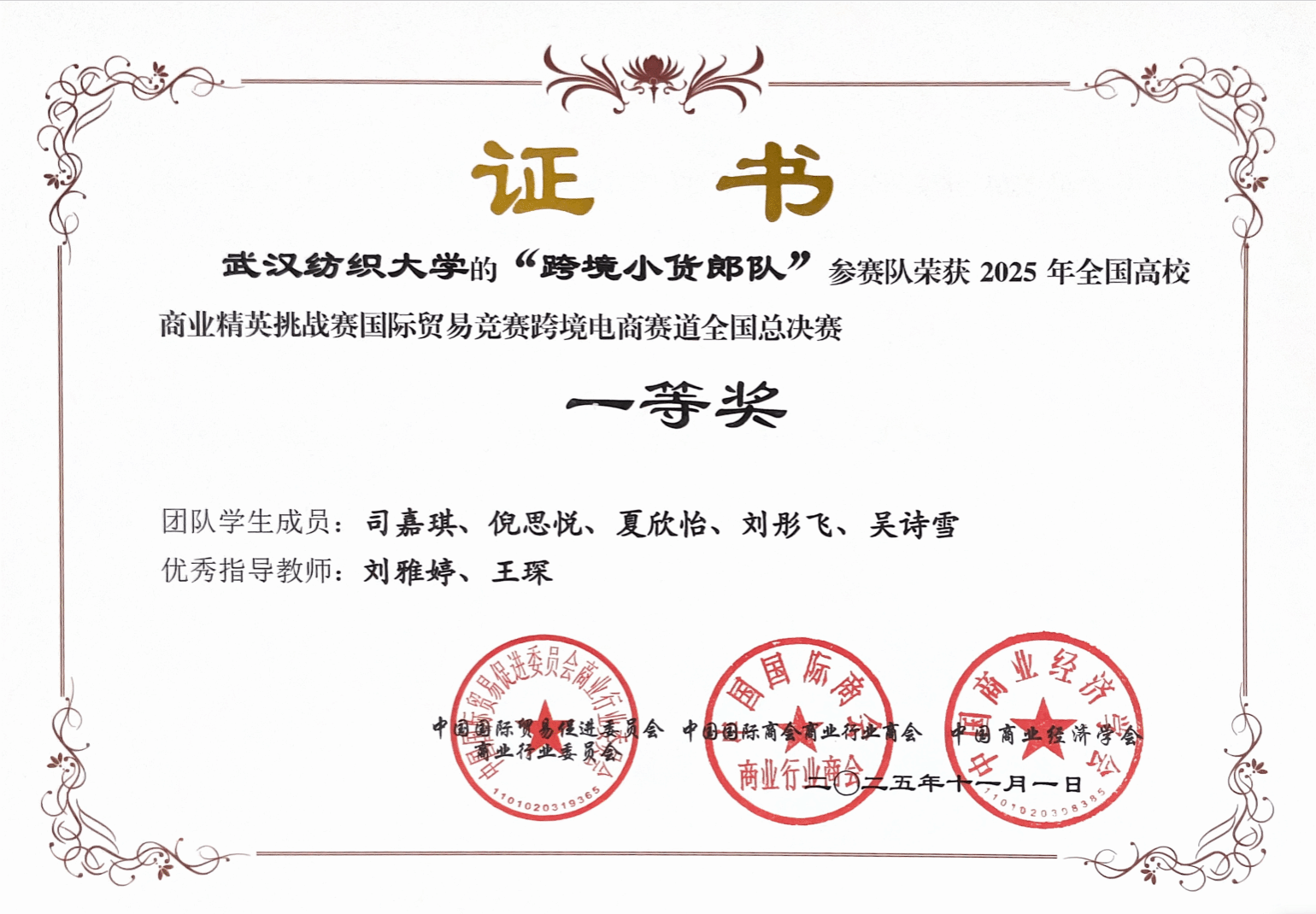 商务英语专业司嘉琪同学领衔的“跨境小货郎”团队(商英司嘉琪,税收倪思悦,电信夏欣怡,英语刘彤飞,数媒吴诗雪)在刘雅婷和王琛老师的指导下斩获全国总决赛一等奖。