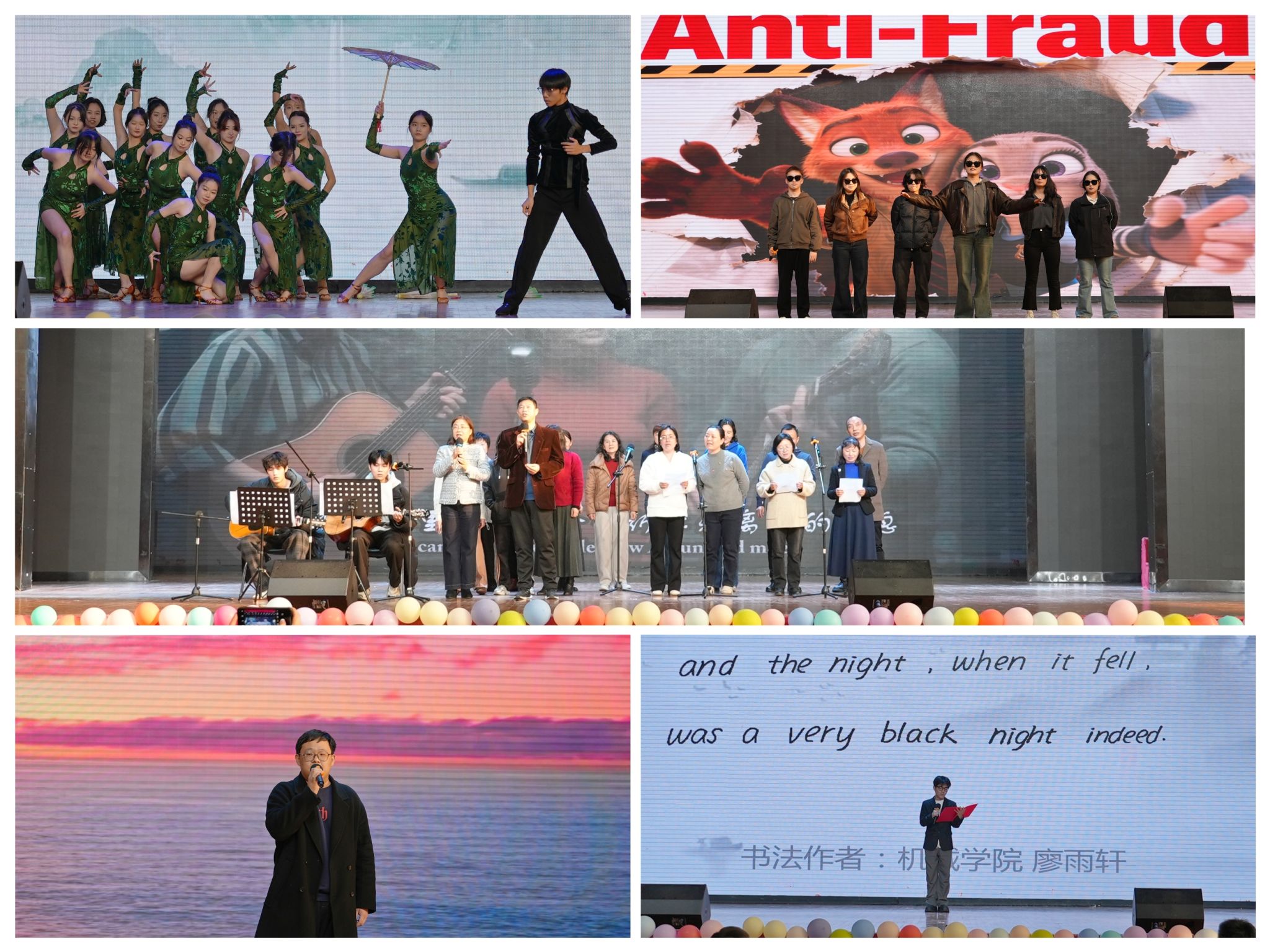 第三篇章“情谊绵长,师心相传” 将活动推向情感高潮。师生同台演绎的伴唱 Five Hundred Miles、研究生话剧 Anti-Fraud、深情独唱 Nothing's Gonna Change My Love For You等节目,生动诠释了师生间亦师亦友的深厚情谊。古典舞《青子吟》融合传统韵味与现代编排,朗诵书法表演 Virginibus Puerisque and Other Papers 则展示了跨学院合作下的人文素养。在本篇章中,校团委副书记侯畅为外语文化节系列分项赛事的获奖集体与个人代表颁奖;学生工作部副部长朱美龙为受聘的本科生导师颁发聘书,标志着全员育人机制再深化。研究生院副院长张强、成人文学