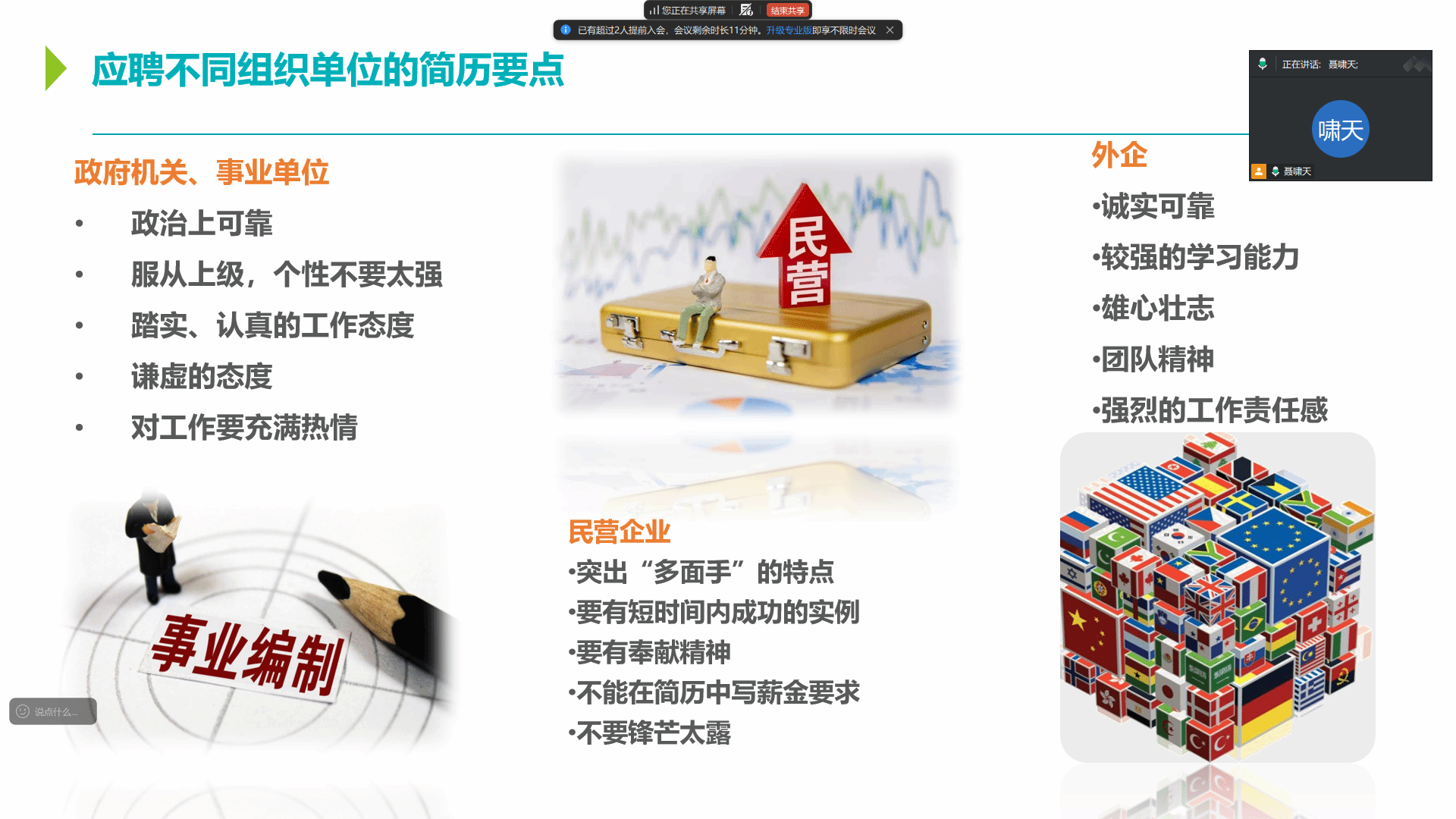 毕业生辅导员通过线上平台,为毕业年级学生举办了一场主题为“简历制作与求职技巧”的就业指导会议。会议聚焦当前就业形势,从雇主视角出发,为学生提供了实用、深入的求职策略。