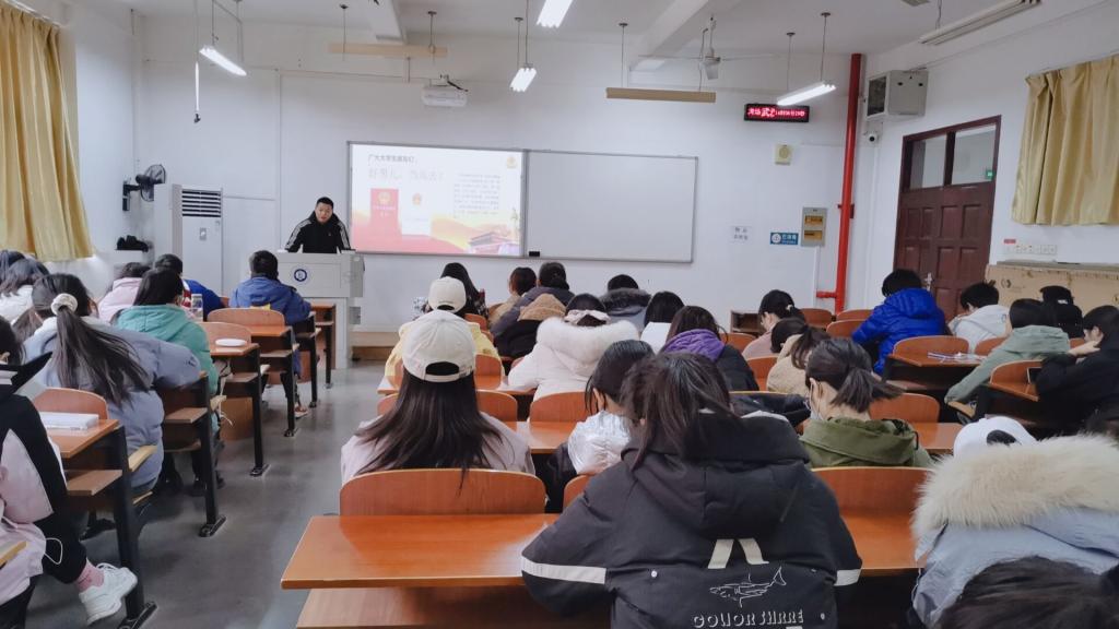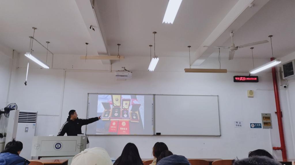 在崇志楼102教室组织征兵入伍宣传,学院辅导员聂啸天进行授课和政策宣讲。