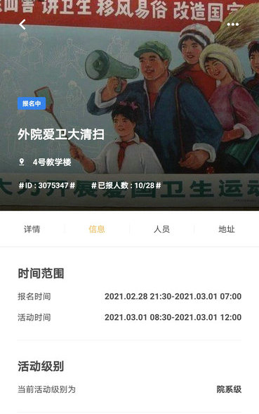 结合开展新时代爱国卫生运动和“学习雷锋月”活动,通过“到梦空间”第二课堂网络管理系统发布崇文楼教学区域卫生清扫志愿活动,各年级学生自发踊跃报名,近30名学生参加了此次活动。