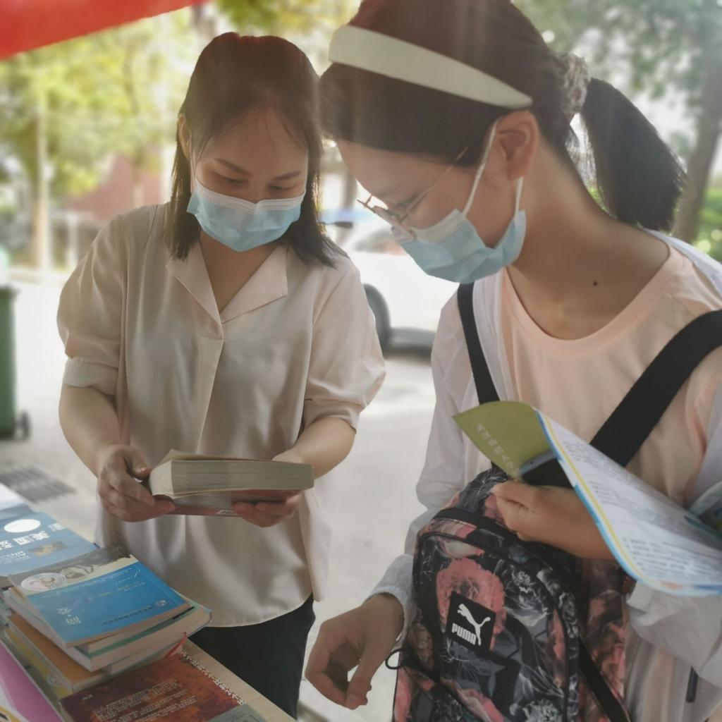 图为志愿者老师为新生选择赠书