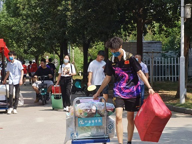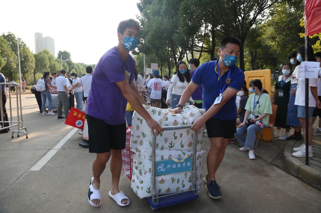 图为学院志愿者老师帮助新生搬运行李