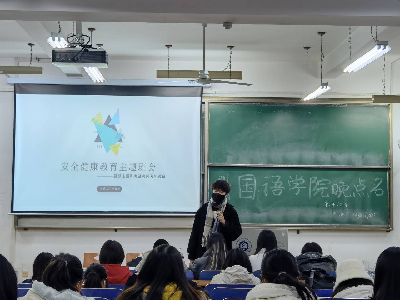 周鹏同学从疫情防控教育消防安全、防炸骗教育与考风考纪教育三个方面分别讲述。首先,他提出,疫情尚未结束,防控工作依旧不能大意,学院将持续加强学生日常健康管理,严格审批学生外出离校手续,同时,学院所有学生都应接种新冠疫苗,做到应接尽接,构筑校园免疫屏障,在即将到来的寒假期间也要进行家校联动,凝聚安全监管活力。然后,周鹏同学向大家科普了防诈骗常识和消防安全知识。
