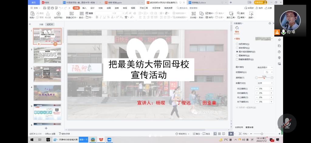 举办了“把美好纺大带回母校”活动经验分享线上会议,本次活动由学院2018级学生、曾获得过第三届“把美好纺大带回母校”实践活动一等奖的团队队长杨璨主持,并为本次参赛队伍成员分享活动经验。