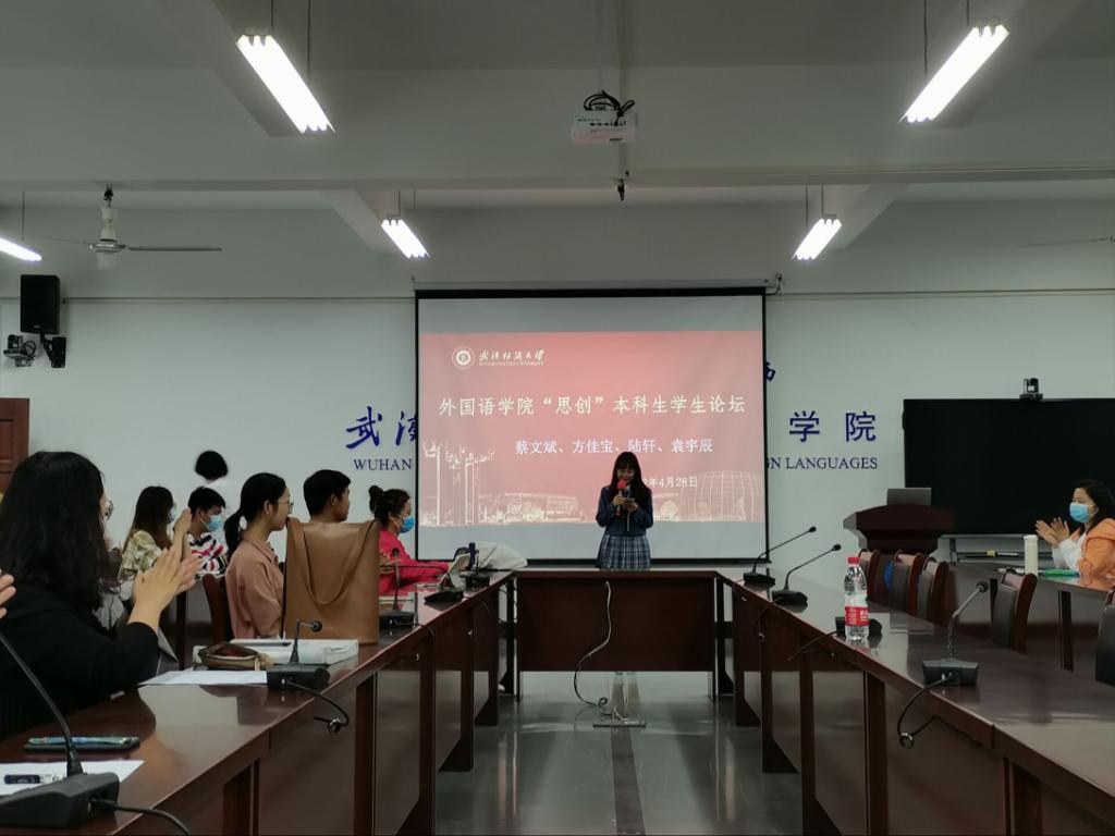 在4教303教室开展本科生“思创”学术论坛。学院副院长罗绮伦,专业教师唐娴、郭婧、吴卉、吴志杰出任评委,各年级学生近50人参加此次活动。
